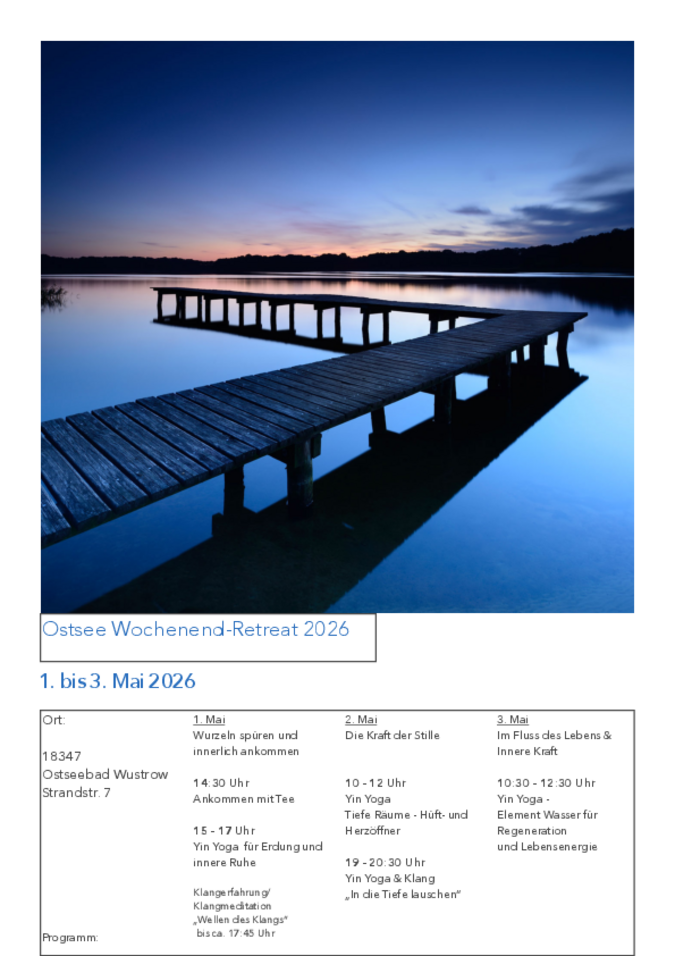 Ein Ostsee-Yoga-Retreat im wunderschönen Ostseebad Wustrow (Fischland/Darss) für mehr Balance in Körper, Geist & Seele - mit Yoga, Meditation, Klang und frischer Ostseeluft. Begib dich auf diese heilsame Reise, die dich wieder bei dir ankommen lässt. Termin: 1. Mai bis 3. Mai 2026.